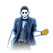 The dancer is a homo who dresses in smart coincidental attire. He wears a pair of square-framed sunglasses and has a mustache and beard, mostly going underneath his head (similar to a goatee). His neatly combed hair is in a shade of dark dark-brown nearing black. He is in a dark bluish jacket with a light blue shirt, greyness vest, and a black bow tie. His tight pants are night blue and his shoes are gray, black, blueish, and white.